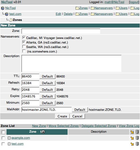 After entering the zone name and choosing the nameservers, click the MailAddr's "Default" button and it'll update to a more appropriate value. Then click "Create" and your zone is created.