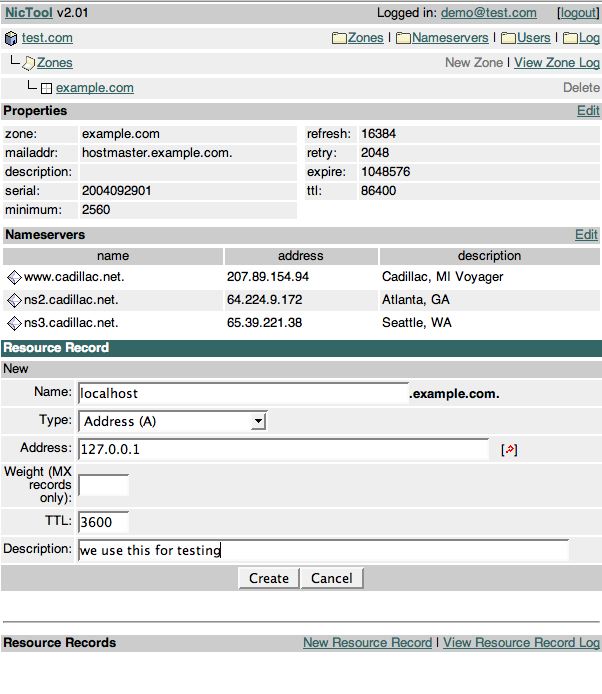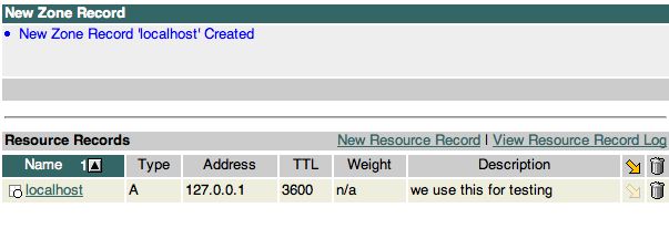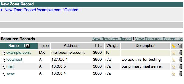 Here you enter the hostname, select the record type, and enter the address to be used and optionally, a description. Below are several samples of record creation, as well as the results of entering each record. I also include a brief description of the "rules" you need to abide by when creating zone records. This is what's returned when I clicked "Create" on the screen shown above: