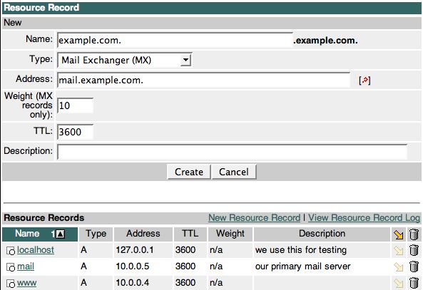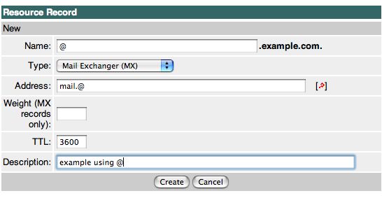 You should notice that we entered the zone name in the Name field fully qualified (ie, it ends in a period). This is necessary unless you are creating MX records for subdomains (eg: office2.example.com). When in doubt, you should always fully quality the record name. Forgetting the period is a common error. If you forget to enter the period, the zone name get's automatically appended and you create a MX record for example.com.example.com., and in nearly every case, that's not what you intended.