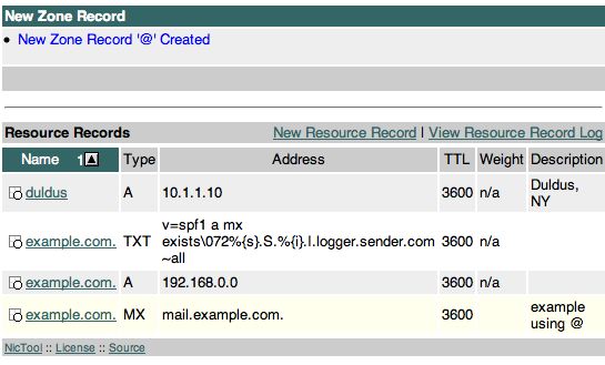 And voila, the record is created. Now we can create the MX record and point it at our new mail server's hostname. Keep in mind that MX records must point to a fully qualified domain name and NicTool enforces this requirement. You cannot point a MX record at an IP address.